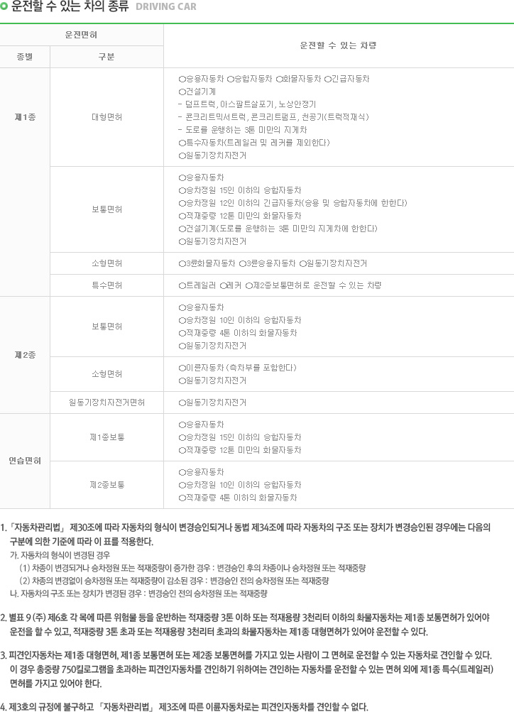 각 면허별로 운전할 수 있는 차의 종류를 보실 수 있습니다.